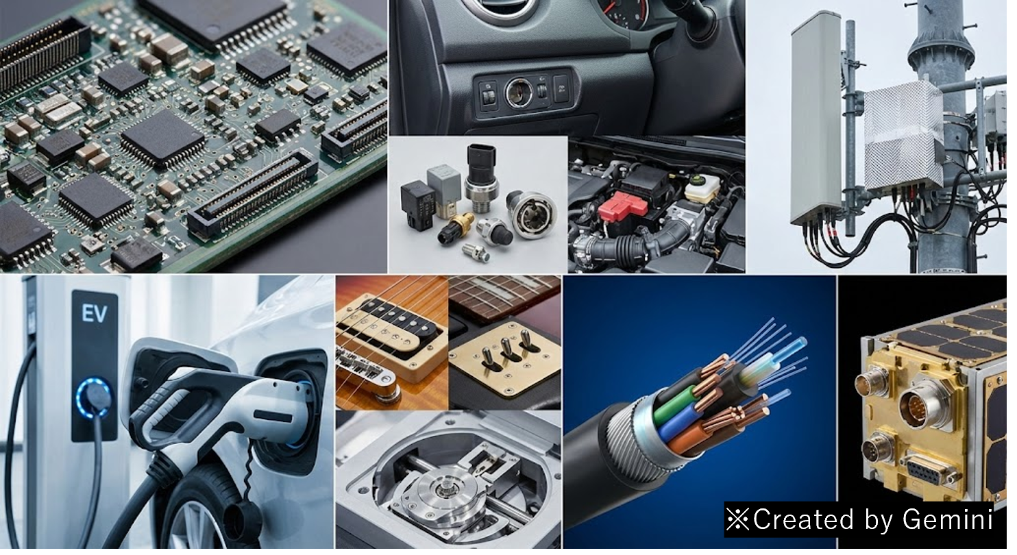 • エレクトロニクス:高密度実装、高信頼性コネクタ、スイッチ、リレー、ソケットなど